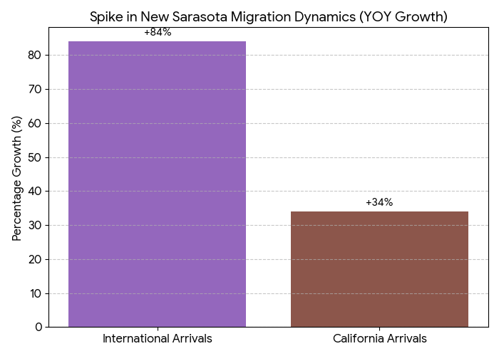 International buyers—a segment that largely vanished during the pandemic—are back with a vengeance. Sarasota County saw over 1,300 new residents arrive from foreign countries and U.S. territories over the past year, an astonishing 84% spike compared to pre-2020 averages. Furthermore, the traditional East Coast monopoly on Gulf Coast real estate is officially cracked. Western wealth is making its way across the country; California migration into Sarasota jumped 34% over the last year, with buyers from Colorado, Washington, and Oregon increasingly trading mountain views for deep-water docks.