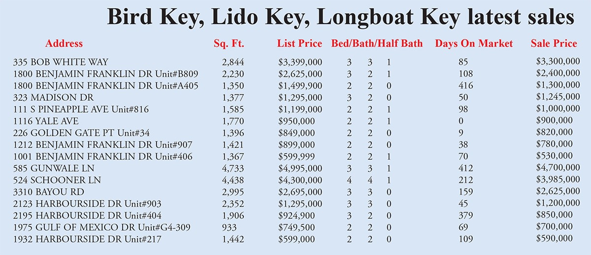 Bird Key, Lido Key, Longboat Key sales week ending April 10, 2026 585 Gunwale Lane, Longboat Key. Previous articleBeyond the Snowbird: Global Cash, Western Wealth and the New Migration Matrix Rewiring Sarasota’s CoastNext articleLongboat Key News April 10, 2026 edition flipbook LEAVE A REPLY Cancel reply Comment: Please enter your comment! Name:* Please enter your name here Email:* You have entered an incorrect email address! Please enter your email address here Website: Save my name, email, and website in this browser for the next time I comment. Δ FacebookXPinterestWhatsApp Popular The Empire in Retreat: Surviving the Psychology of a Tennis Losing Streak It’s Wine Time! On Patrol Longboat Key Police reports week of April 10, 2026 Longboat Key & Sarasota Letters to the Editor week of April 10, 2026 Longboat Key News April 10, 2026 edition flipbook Read our Latest... The Empire in Retreat: Surviving the Psychology of a Tennis Losing Streak lbknews - April 11, 2026 —Last week in the Longboat Key News, we explored... It’s Wine Time! lbknews - April 11, 2026 —The cover of the program for the April 8,... On Patrol Longboat Key Police reports week of April 10, 2026 lbknews - April 11, 2026 —April 3 —Civil —11:29 a.m. —Sgt. Smith was dispatched to... Longboat Key & Sarasota Letters to the Editor week of April 10, 2026 lbknews - April 11, 2026 —High-span bridge the right choice —To: Editor —My wife has...