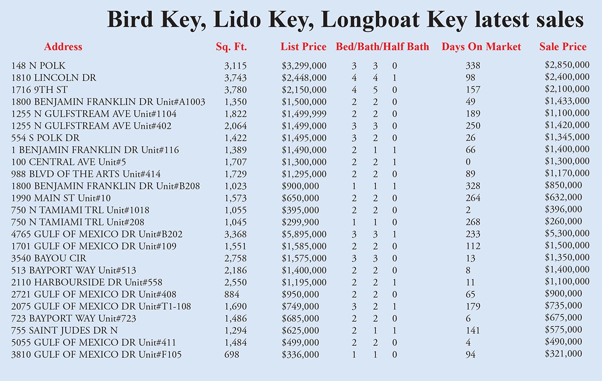 Bird Key, Lido Key, Longboat Key sales week ending February 20, 2026 Previous articleLongboat Key News February 20, 2026 edition flipbookNext articleLongboat Key & Sarasota Letters to the Editor week of February 20, 2026 LEAVE A REPLY Cancel reply Comment: Please enter your comment! Name:* Please enter your name here Email:* You have entered an incorrect email address! Please enter your email address here Website: Save my name, email, and website in this browser for the next time I comment. Δ FacebookTwitterPinterestWhatsApp Popular Longboat Key & Sarasota Letters to the Editor week of February 20, 2026 Longboat Key News February 20, 2026 edition flipbook Massive Bridge and Roundabout Projects Set to Transform Longboat From Red Carpets to Real Lives: The Soulful Evolution of Longboat’s Marty Hurwitz Race Against the Freeze: Mote Marine Battles Cold to Rescue Florida Icons Read our Latest... Longboat Key & Sarasota Letters to the Editor week of February 20, 2026 lbknews - February 21, 2026 Editorial Opinion To: Editor Thank you, thank you, thank you! Well... Longboat Key News February 20, 2026 edition flipbook lbknews - February 21, 2026 Massive Bridge and Roundabout Projects Set to Transform Longboat lbknews - February 14, 2026 STEVE REID Editor & Publisher sreid@lbknews.com For residents of Longboat Key, the... From Red Carpets to Real Lives: The Soulful Evolution of Longboat’s Marty Hurwitz lbknews - February 14, 2026 STEVE REID Editor & Publisher sreid@lbknews.com Shamans often speak of a transformative...