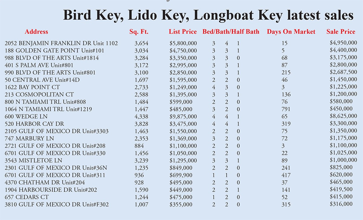 Bird Key, Lido Key, Longboat Key sales week ending February 27, 2026 Previous articleLongboat Key News February 27, 2026 edition flipbookNext articleLongboat Key & Sarasota Letters to the Editor week of February 27, 2026 LEAVE A REPLY Cancel reply Comment: Please enter your comment! Name:* Please enter your name here Email:* You have entered an incorrect email address! Please enter your email address here Website: Save my name, email, and website in this browser for the next time I comment. Δ FacebookXPinterestWhatsApp Popular Longboat Key & Sarasota Letters to the Editor week of February 27, 2026 Longboat Key News February 27, 2026 edition flipbook A Bridge Too Far, A Span Too High: FDOT’s Towering Disregard for Longboat Key State Pushes Mega-Bridges Forward as Longboat Loses Battle for ‘Modest’ Spans Trojan Horse on Circle: How a ‘Visioning’ Session Could Pave Way for St. Armands Hotelization Read our Latest... Longboat Key & Sarasota Letters to the Editor week of February 27, 2026 lbknews - February 28, 2026 Garbage pickup To: Jim Haft The current contract with Waste Management... Longboat Key News February 27, 2026 edition flipbook lbknews - February 28, 2026 A Bridge Too Far, A Span Too High: FDOT’s Towering Disregard for Longboat Key lbknews - February 21, 2026 STEVE REID Editor & Publisher sreid@lbknews.com It was really the classical Greeks... State Pushes Mega-Bridges Forward as Longboat Loses Battle for ‘Modest’ Spans lbknews - February 21, 2026 STEVE REID Editor & Publisher sreid@lbknews.com The era of the quaint barrier...