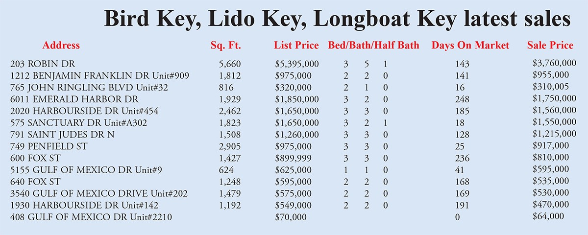 Bird Key, Lido Key, Longboat Key sales week ending October 31, 2025 Previous articleGreat but Neglected Wines…Next articleJoel Feidelman: A Life Lived with Passion for Music, Sports & Community LEAVE A REPLY Cancel reply Comment: Please enter your comment! Name:* Please enter your name here Email:* You have entered an incorrect email address! Please enter your email address here Website: Save my name, email, and website in this browser for the next time I comment. Δ FacebookTwitterPinterestWhatsApp Popular A Year without Storms Fuels Rebirth of Region Sarasota’s Arts Scene Invests Half a Billion in Future Longboat Key’s Bayfront Park Unveils a ‘Living Seawall’ Sarasota Tourism Takes a $9.5 Million Hit in September, Citing Stiff Competition Longboat Key Road Work Alert: Night Closures Scheduled for GMD Resurfacing Read our Latest... A Year without Storms Fuels Rebirth of Region lbknews - November 2, 2025 STEVE REID Editor & Publisher sreid@lbknews.com The current tranquil weather – as... Sarasota’s Arts Scene Invests Half a Billion in Future lbknews - November 2, 2025 Sarasota is witnessing a cultural and economic transformation as... Longboat Key’s Bayfront Park Unveils a ‘Living Seawall’ lbknews - November 2, 2025 Longboat Key is trading flat, sterile concrete for textured,... Sarasota Tourism Takes a $9.5 Million Hit in September, Citing Stiff Competition lbknews - November 2, 2025 Sarasota County’s tourism sector experienced a notable slowdown in...