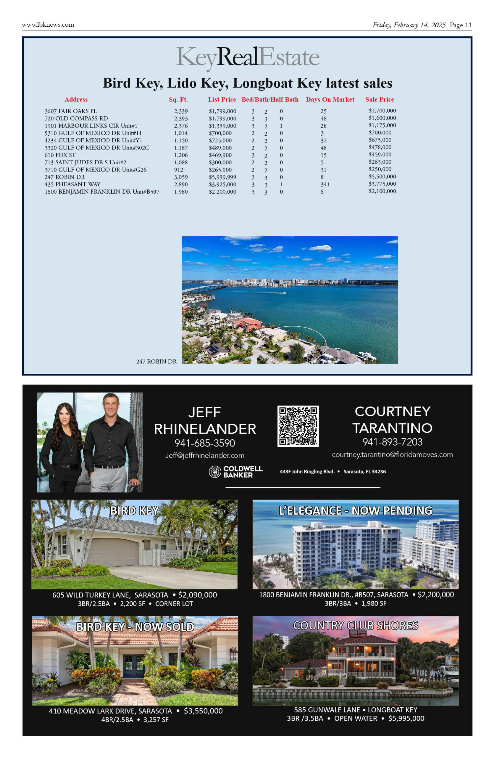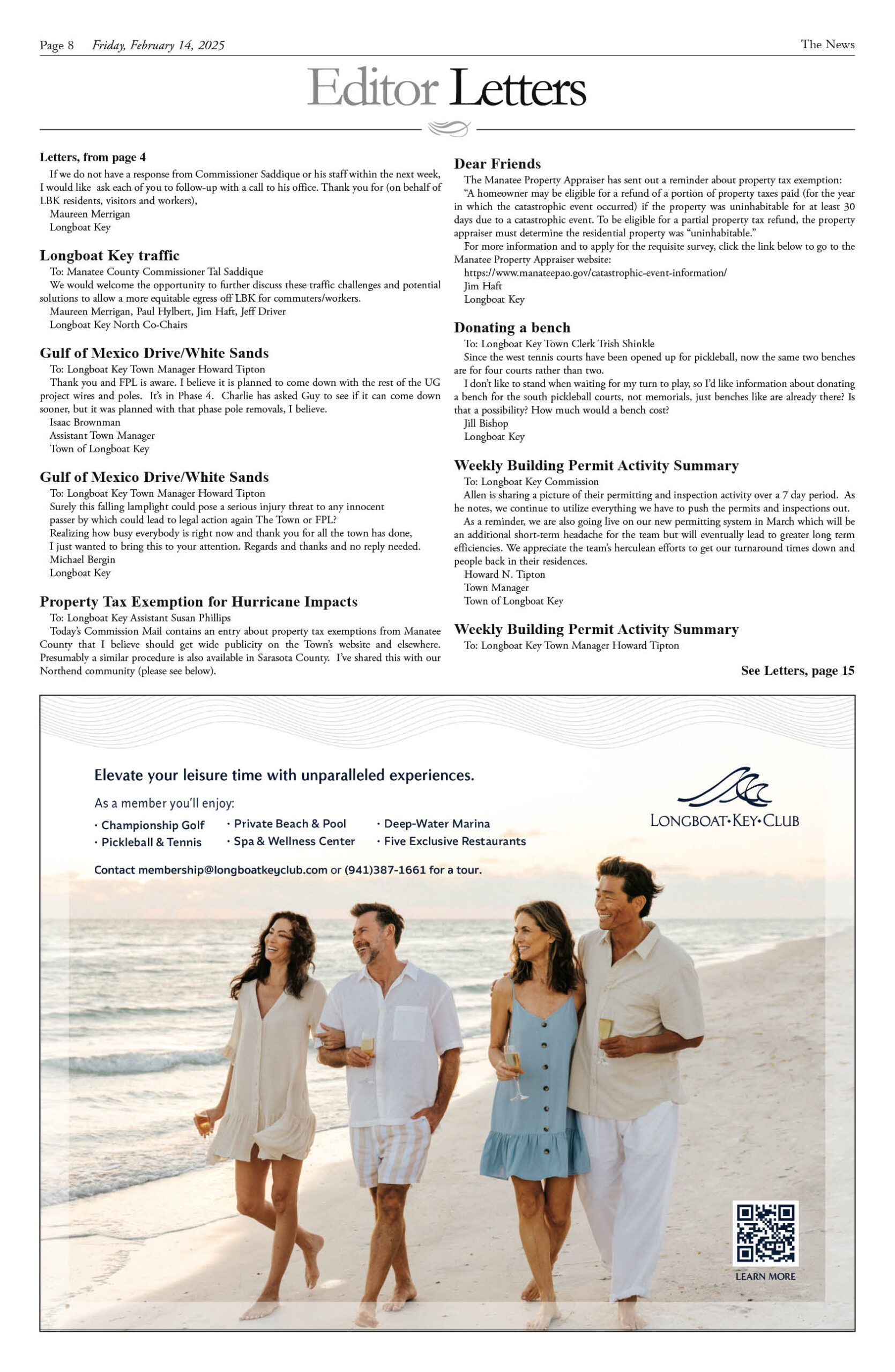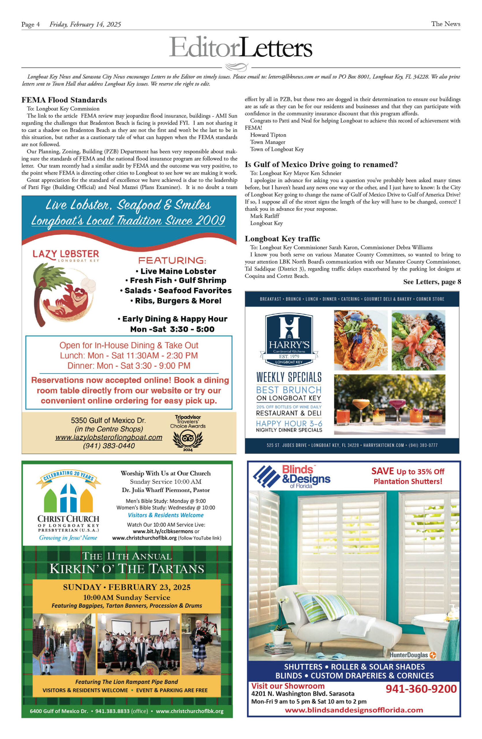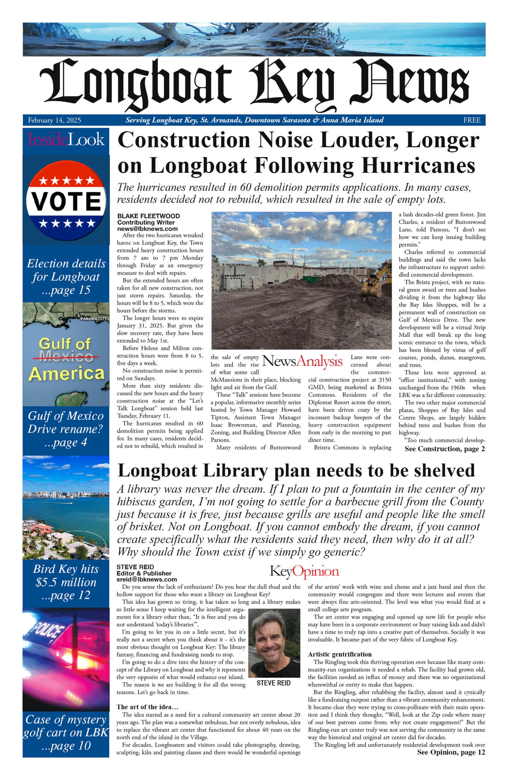 February 14 Print Newspaper e-edition Previous articleOn Patrol Longboat Key Police reports week of February 14, 2025Next articleLongboat Key & Sarasota Letters to the Editor week of February 14, 2025 LEAVE A REPLY Cancel reply Comment: Please enter your comment! Name:* Please enter your name here Email:* You have entered an incorrect email address! Please enter your email address here Website: Save my name, email, and website in this browser for the next time I comment. Δ FacebookTwitterPinterestWhatsApp Popular Sarasota and Longboat Execute ‘Luxury Reset’ and Challenge Naples Dominance for 2026 End of the “Purple War”? Van Wezel Heirs Back New $300M+ Performing Arts Center as Project Pivots Stick Figure Drummer Kevin Offitzer to host Meet-and-Greet at Cirque St. Armands Why the 2026 Australian Open Belongs to the New Ruling Class Infrastructure Upgrades Begin on St. Armands Artery Despite Concerns Read our Latest... Sarasota and Longboat Execute ‘Luxury Reset’ and Challenge Naples Dominance for 2026 lbknews - January 11, 2026 STEVE REID Editor & Publisher sreid@lbknews.com As the first cold fronts of... End of the “Purple War”? Van Wezel Heirs Back New $300M+ Performing Arts Center as Project Pivots lbknews - January 11, 2026 The ambitious, often contentious effort to build a world-class... Stick Figure Drummer Kevin Offitzer to host Meet-and-Greet at Cirque St. Armands lbknews - January 11, 2026 STEVE REID Editor & Publisher sreid@lbknews.com For fans of American reggae, the... Why the 2026 Australian Open Belongs to the New Ruling Class lbknews - January 11, 2026 STEVE REID Editor & Publisher sreid@lbknews.com The air in Melbourne tastes like...