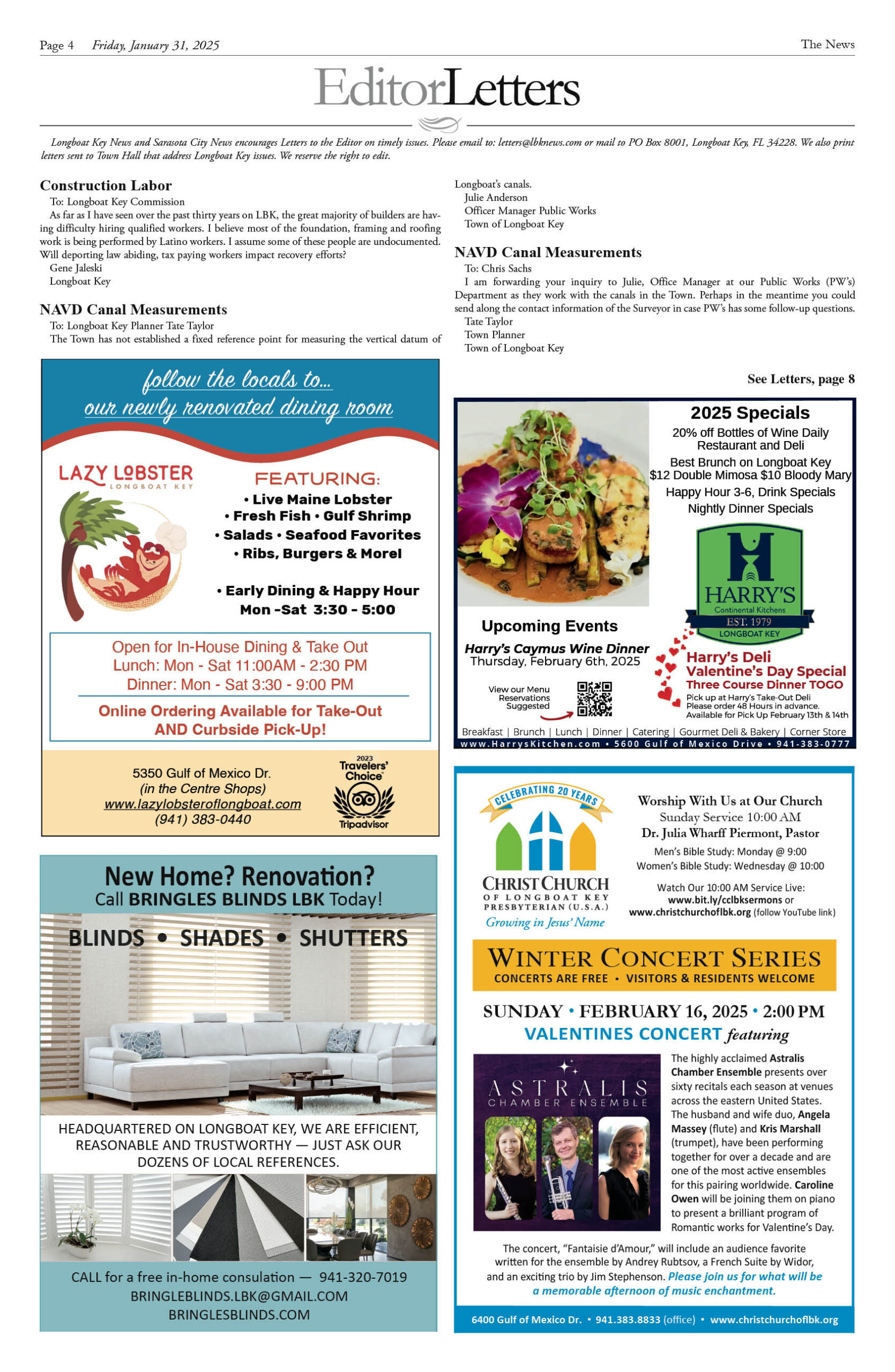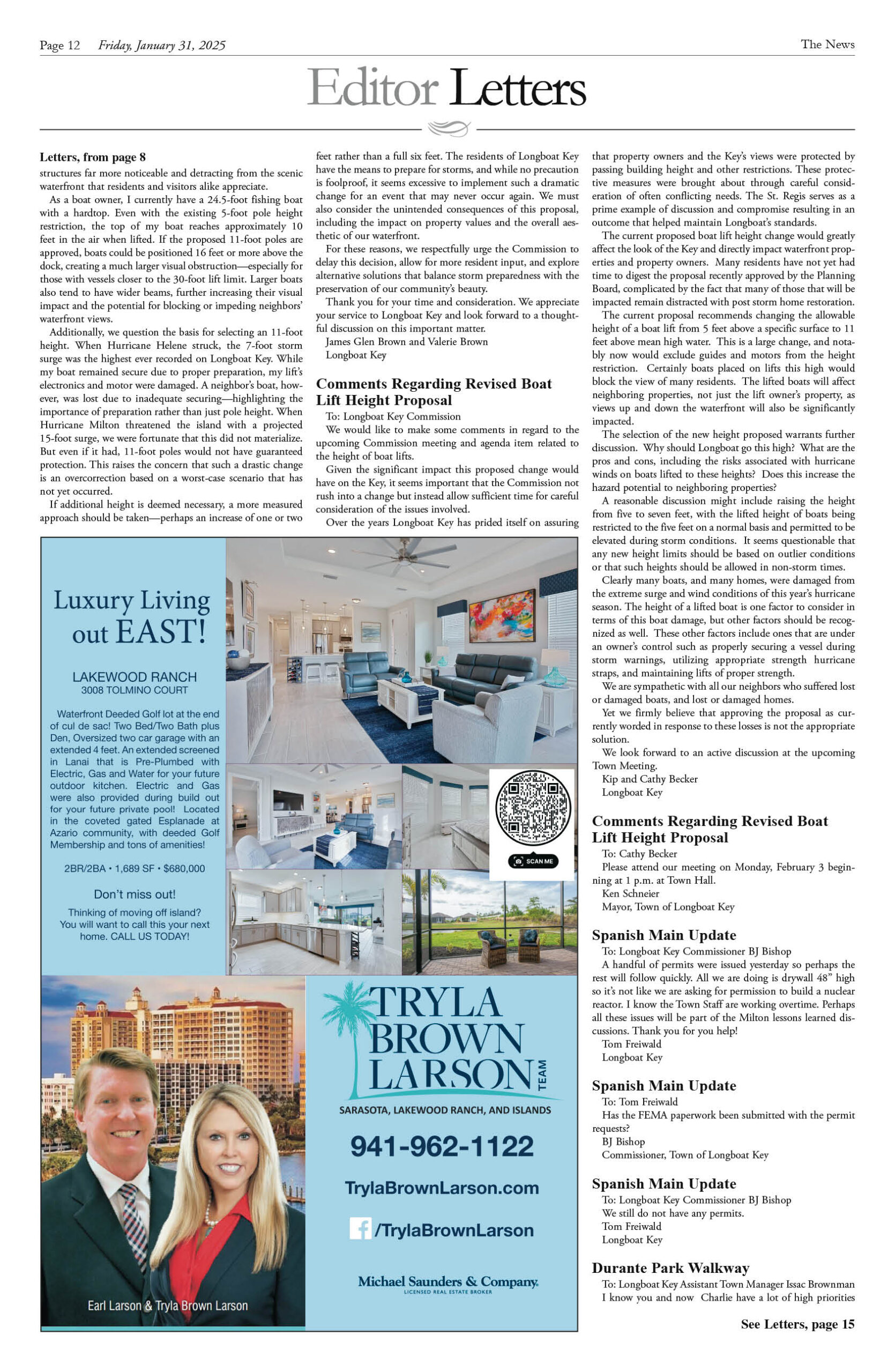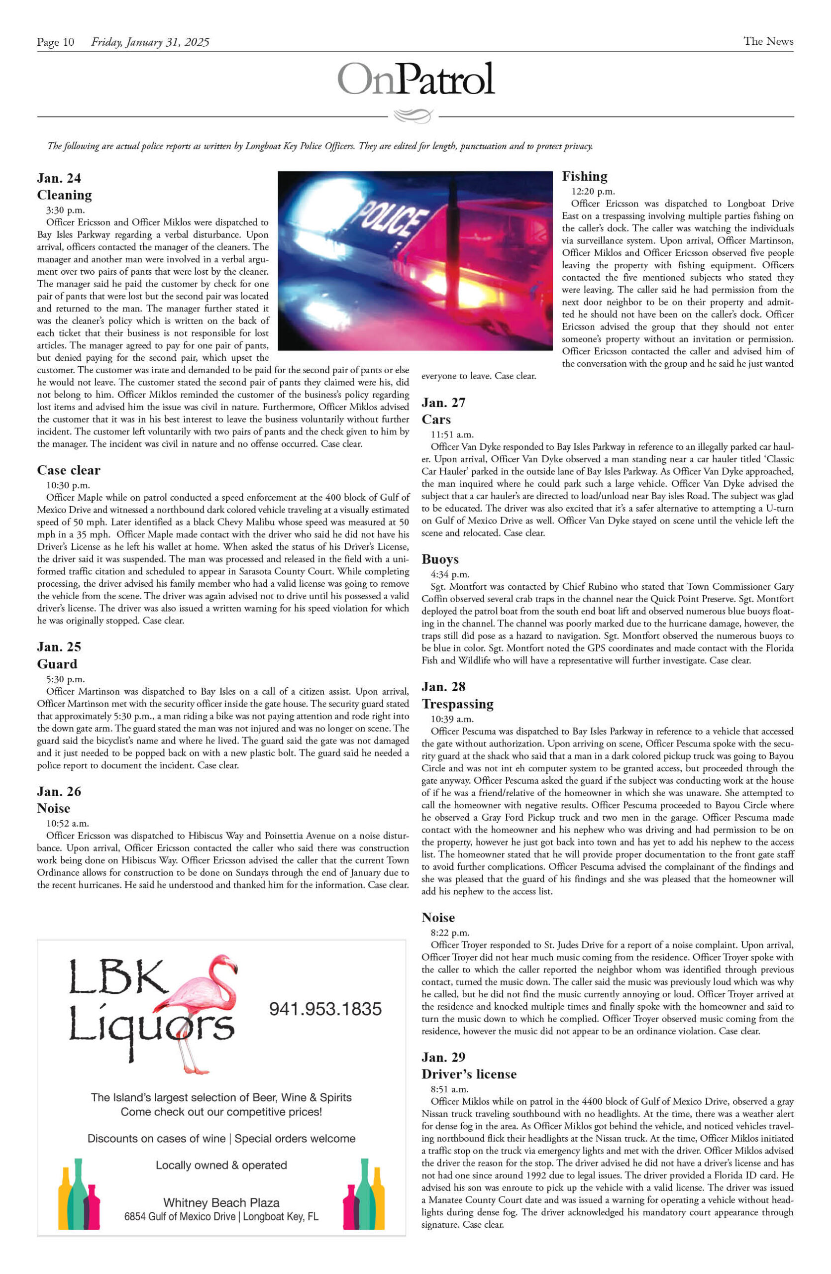 January 31 Print Newspaper e-edition Previous articleOn Patrol Longboat Key Police reports week of January 31, 2025Next articleBird Key, Lido Key, Longboat Key latest sales week ending January 24, 2025 LEAVE A REPLY Cancel reply Comment: Please enter your comment! Name:* Please enter your name here Email:* You have entered an incorrect email address! Please enter your email address here Website: Save my name, email, and website in this browser for the next time I comment. Δ FacebookTwitterPinterestWhatsApp Popular Longboat Key News January 23, 2026 edition flipbook The Sun-Bleached Mecca: How Nick Bollettieri and IMG created the Center of the Tennis Universe Homegrown ‘Sips’ Expands as Corporate Giant Retreats Greatest Show on Earth is Sadly a Clown Show in Plan to ‘Vision’ St. Armands Development A Life of Service and Stewardship: Remembering Randy Clair (1939–2026) Read our Latest... Longboat Key News January 23, 2026 edition flipbook lbknews - January 25, 2026 The Sun-Bleached Mecca: How Nick Bollettieri and IMG created the Center of the Tennis Universe lbknews - January 24, 2026 STEVE REID Editor & Publisher sreid@lbknews.com If you drive down 53rd Avenue... Homegrown ‘Sips’ Expands as Corporate Giant Retreats lbknews - January 24, 2026 STEVE REID Editor & Publisher sreid@lbknews.com In the delicate ecosystem of Longboat... Greatest Show on Earth is Sadly a Clown Show in Plan to ‘Vision’ St. Armands Development lbknews - January 24, 2026 STEVE REID Editor & Publisher sreid@lbknews.com It was T.S. Eliot who said...