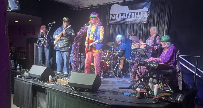 The Mardi Gras celebration at Fogartyville had sold out days before we arrived. No more than two hundred guests sat at tables in front of a small stage to hear Kid Red (A.K.A. Larry Chiri) and the NOLAsota Krewe or Pontchartrain All-Stars (take your pick) pull out all of the stops on the Fat Tuesday carnival finale before the start of Lent. Kid Red hosts the Louisiana Gumbo segment on Radio WSLR Wednesdays 2-4PM, making him the obvious choice for the Mardi Gras gig.