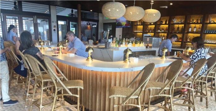 The space that Tommy Bahama’s now occupies, formerly The Shore, has the kitchen, bar, and dining areas on the second level. The entranceway has a chic beach bar look. Guests invited to the soft opening gave the staff a chance to conduct a final training exercise before the official opening to the public on the next day, September 24th.